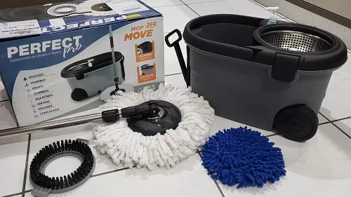 Após testar todos os produtos, considero que o melhor mop giratório é o Perfect Pro 360, de maneira geral. Isso porque ele traz um conjunto bem resolvido para a maioria das rotinas domésticas, com balde robusto, centrífuga eficiente, cabo longo que ajuda bastante na ergonomia e acessórios que realmente ampliam o uso no dia a dia. Na prática, facilita tanto a limpeza leve quanto tarefas mais pesadas, sem exigir esforço excessivo ou improviso. Não é um mop básico, mas também não tenta ser sofisticado além do necessário, o que faz sentido para quem busca funcionalidade, boa durabilidade e praticidade para quem quer algo com excelente custo benefício.